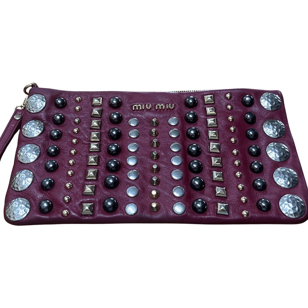 Miu Miu studded leather clutch:•Description: A sleek leather clutch decorated with metal studs, gold-tone. It closes with a top zip , and has a small inside pocket.