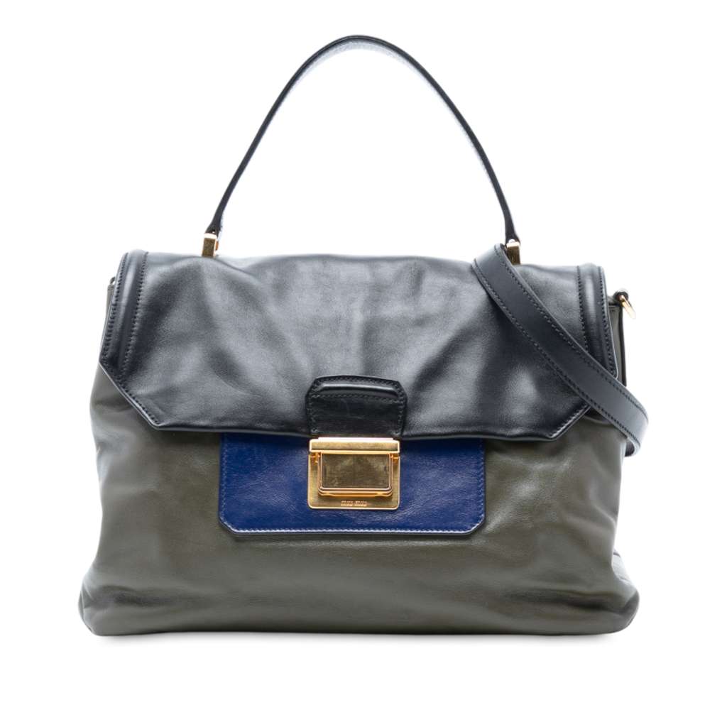 This satchel features a leather body, a flat leather top handle, a detachable flat leather strap, a front flap with a push lock closure, an exterior back zip pocket, and interior zip and slip compartments.