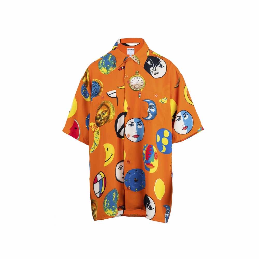 Moschino orange shirt with prints. Wide fit, short sleeves, regular collar, front button placket and two front pockets.