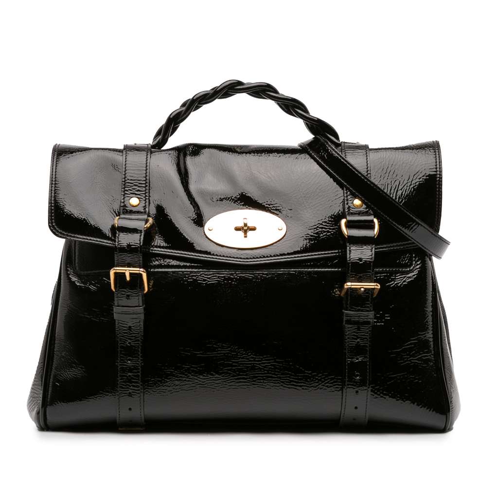 The Alexa features a patent leather body, a flat leather top handle, a detachable flat leather strap, a front flap with buckle and twist lock closure, and interior zip and slip pockets.