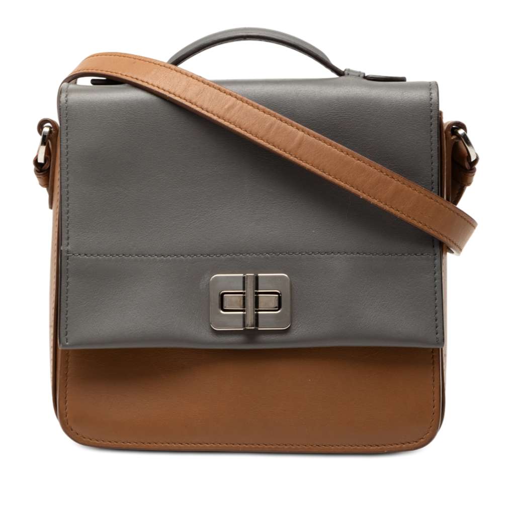 This satchel features a leather body, a flat-top handle, an adjustable flat leather strap, a front flap with twist lock closure, and interior zip and slip pockets.