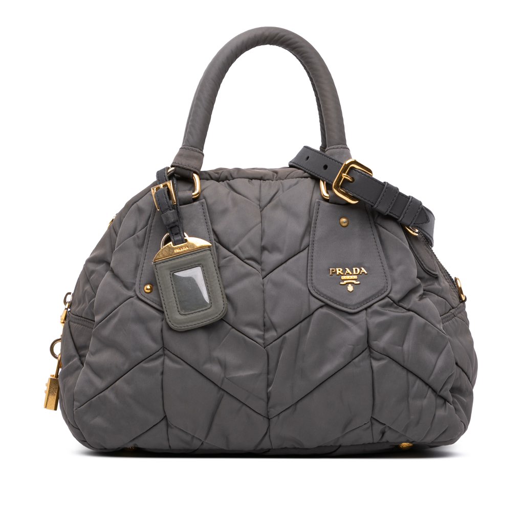 This satchel features a quilted nylon body, rolled leather handles, a detachable flat leather strap, a top zip closure, and interior zip and slip pockets.