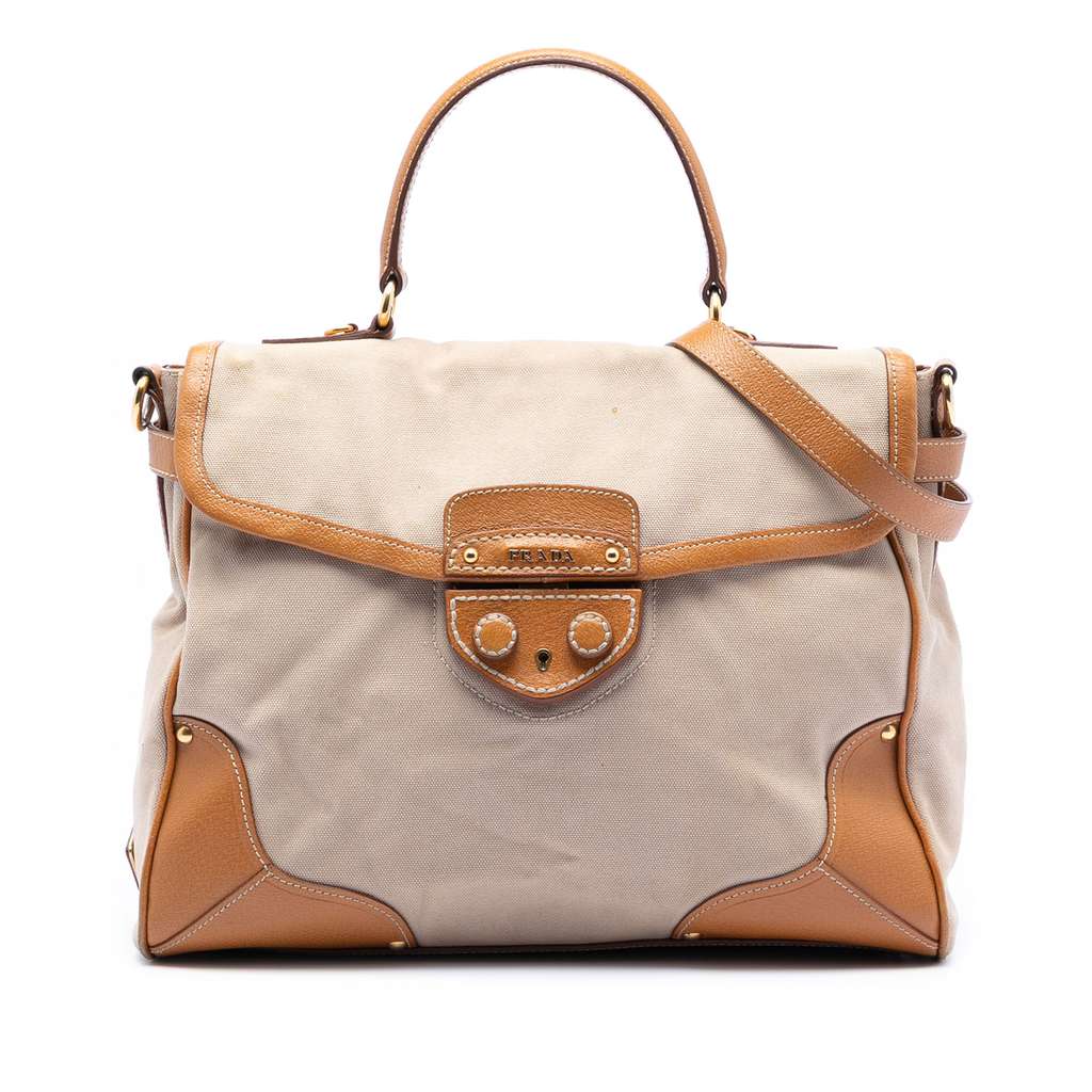 This satchel features a canvas body with pigskin leather trim, a flat top handle, a detachable strap, a front flap with magnetic closure, an exterior back slip pocket, and interior zip and slip pockets.