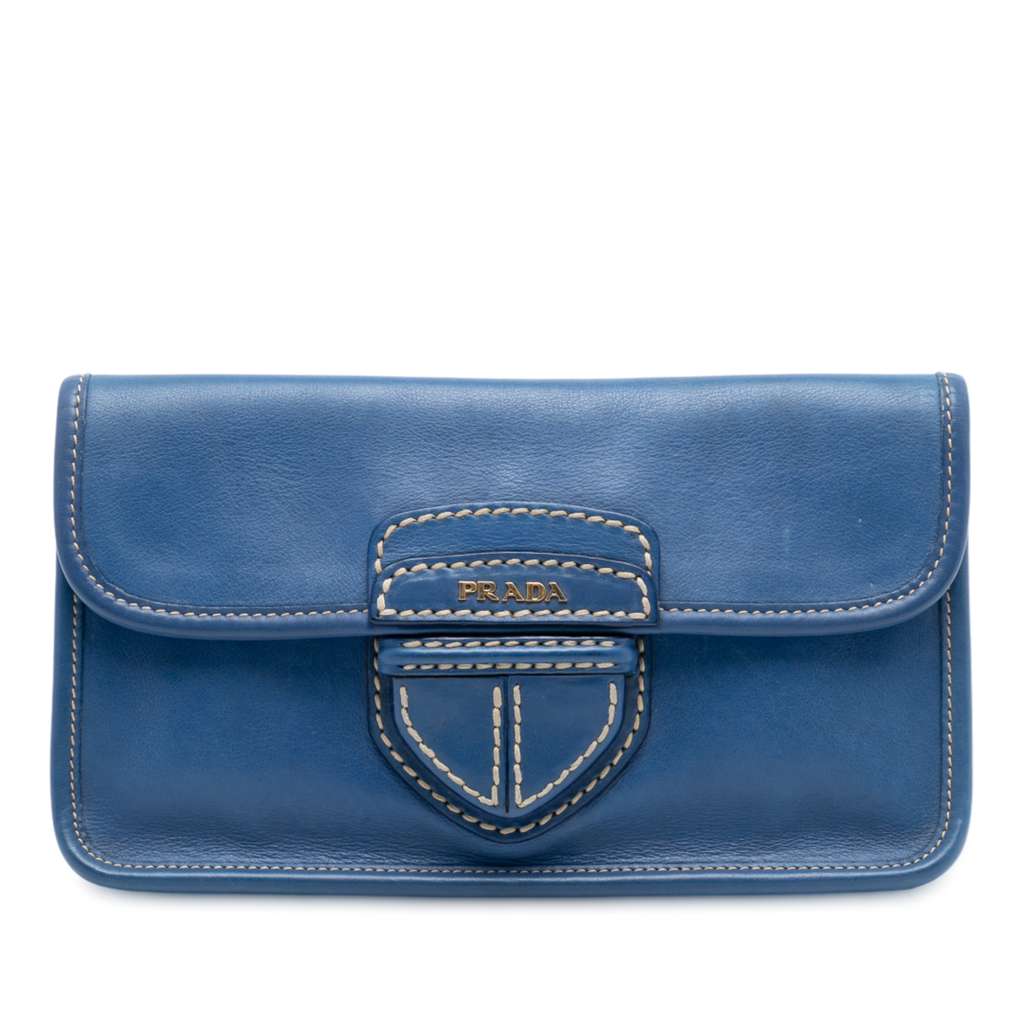 This clutch bag features a leather body, a front flap with a push lock closure, and interior zip and slip pockets.