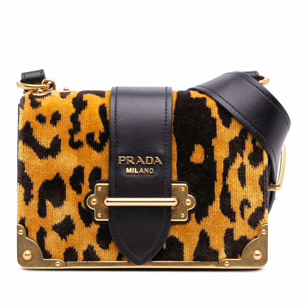 The Cahier features a printed velvet body with calf leather trim, a curb chain strap with leather guard, a flap tab with pull-through closure, and interior slip pockets.