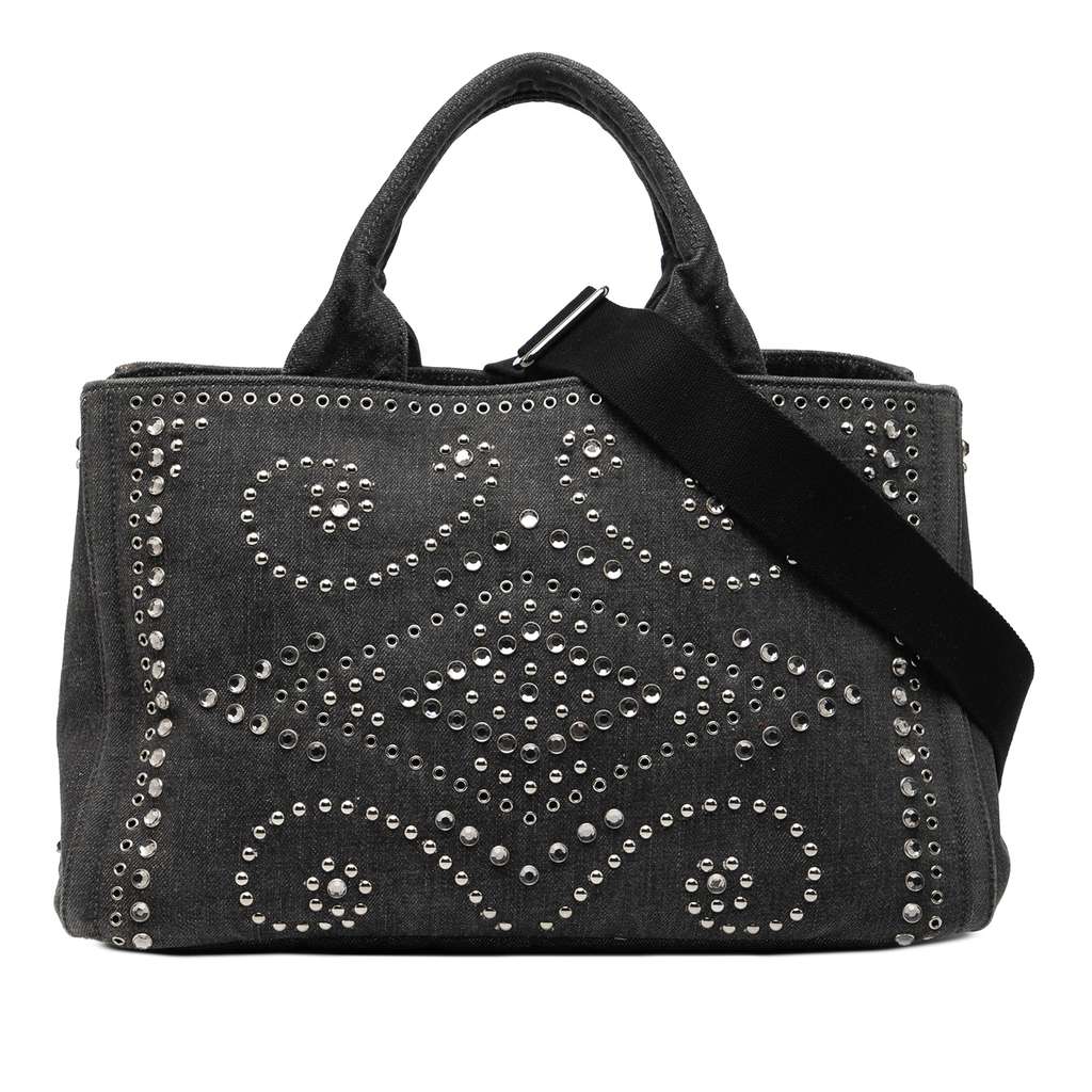 This satchel features a studded denim body, rolled top handles, a detachable flat strap, an open top, and interior zip and slip pockets.