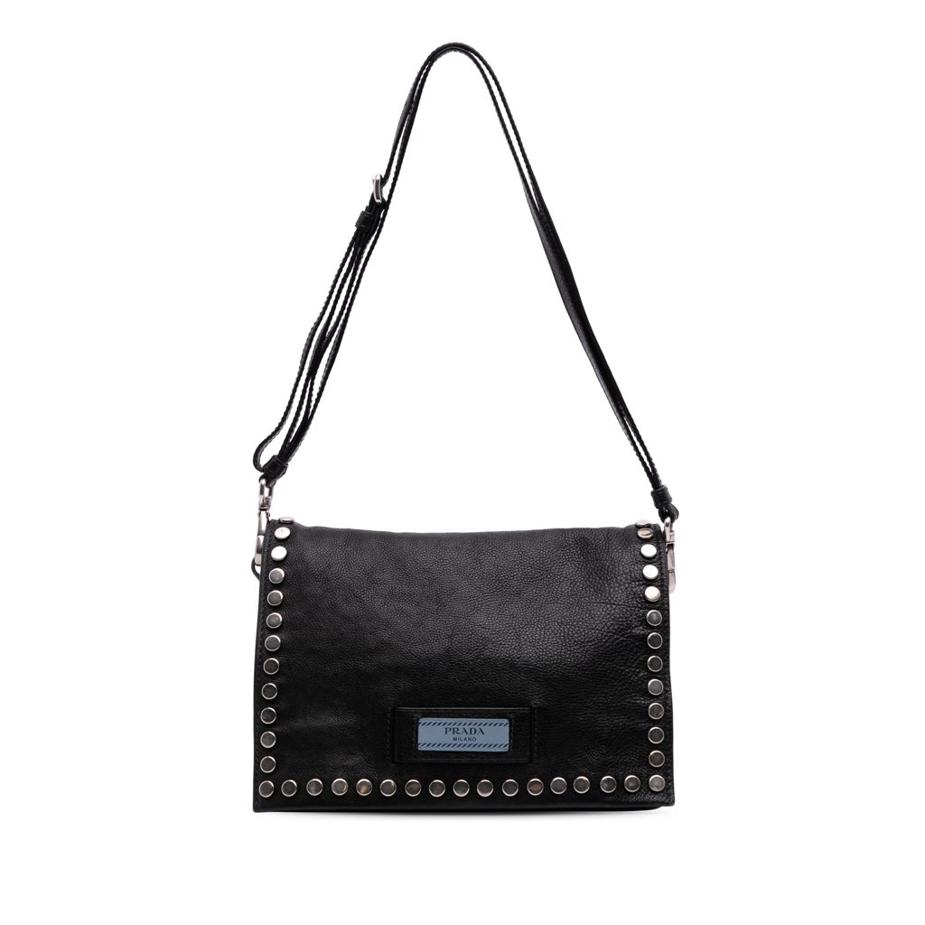 The Etiquette features a studded leather body, an adjustable flat leather strap, a front flap with magnetic closure, and an interior zip pocket.