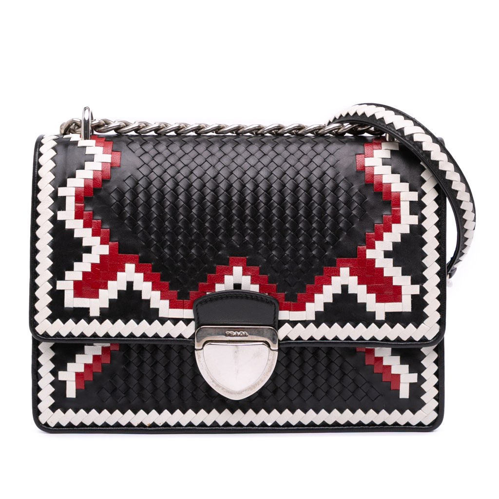 This crossbody bag features a woven goatskin leather body, a chain link strap with woven leather shoulder guard, a front flap with push lock closure, and an interior flap pocket.