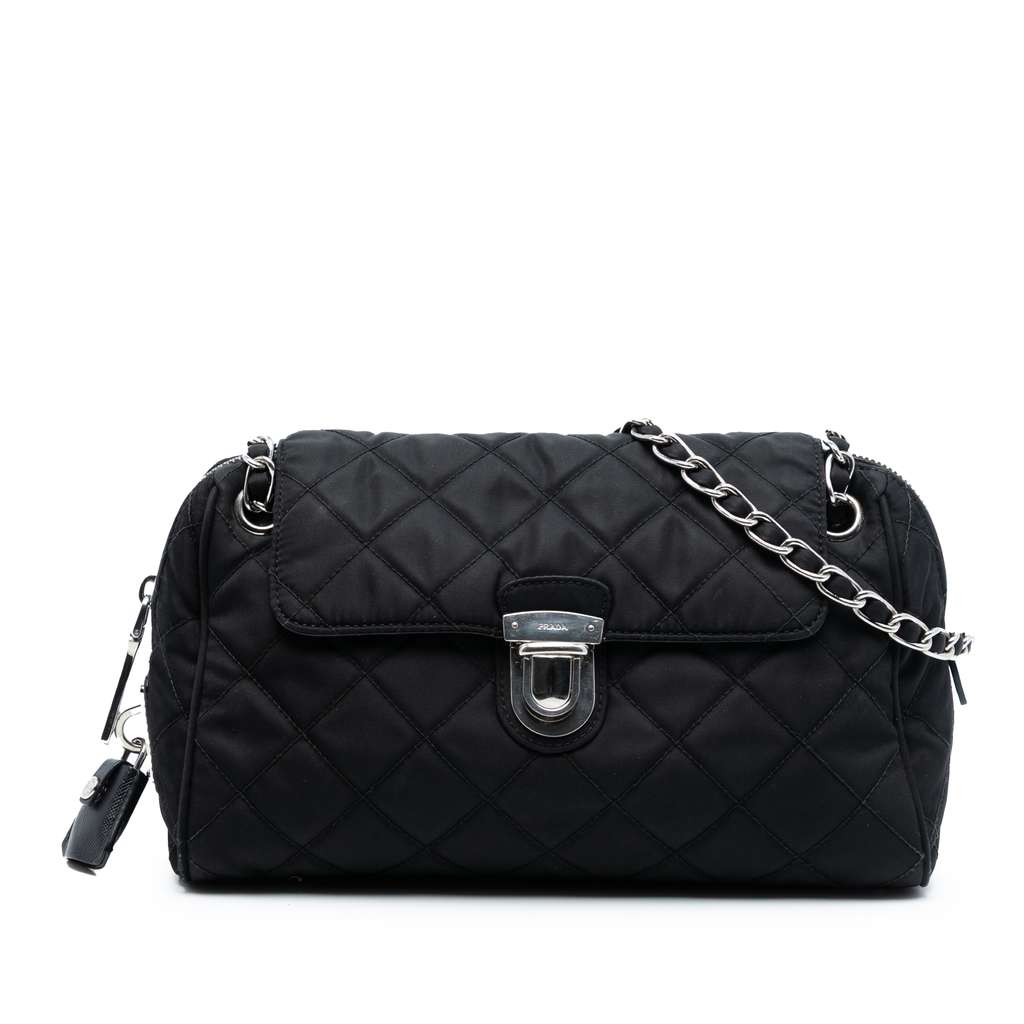 This crossbody bag features a stitched nylon body, a nylon woven chain strap, a front flap with a push lock closure, a zip around closure, and interior zip and slip pockets.