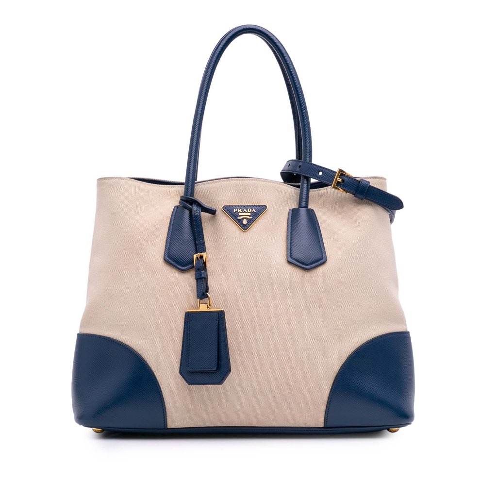 This satchel features a canvas body with saffiano leather trim, rolled saffiano leather handles, a detachable flat shoulder strap, an open top with magnetic closure, and an interior flap pocket.