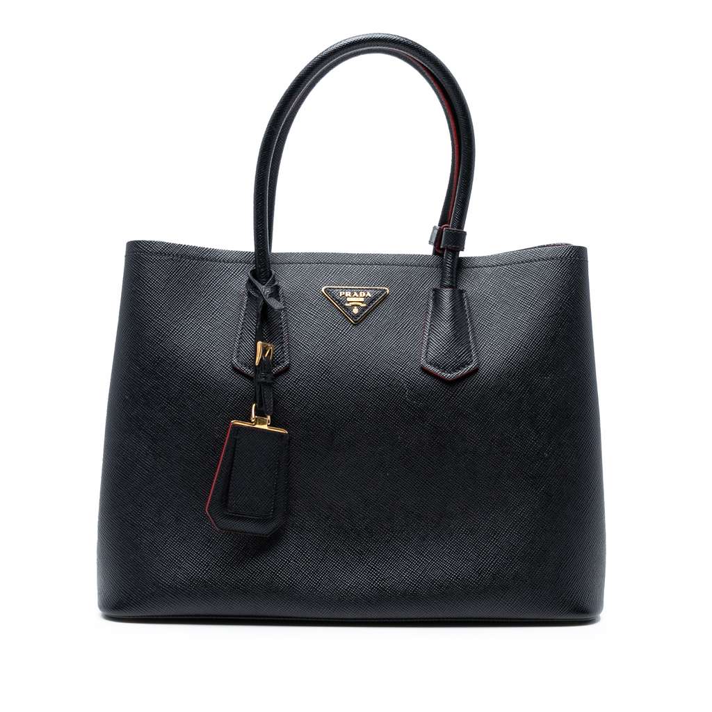 This satchel features a saffiano leather body, rolled leather handles, an open top with side snap button closures, and an interior flap compartment. Handles has been repainted.