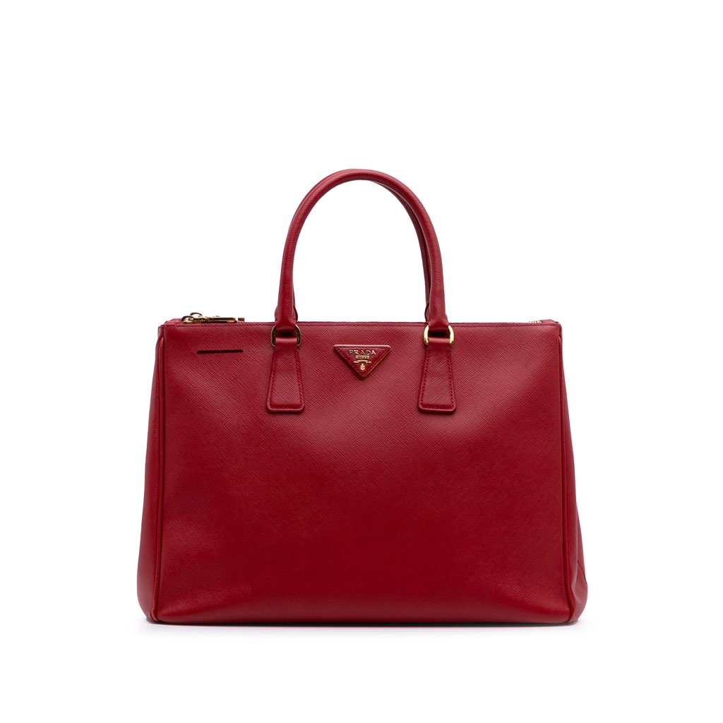 The Galleria features a saffiano leather body, rolled leather handles, an open top, dual zip compartments, and interior zip and slip pockets.