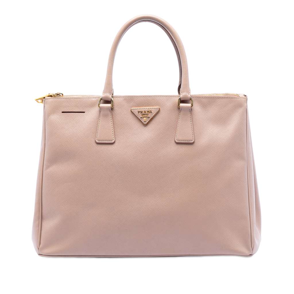 The Galleria features a saffiano leather body, rolled leather handles, an open top with snap closure, top zip compartments, and interior zip and slip pockets.