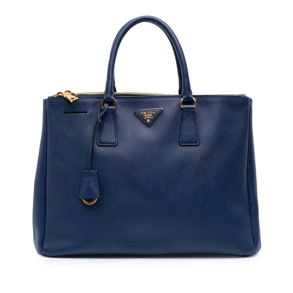 The Galleria Double Zip satchel features a saffiano leather body, rolled handles, an open top, top zip compartments, and interior zip and slip pockets.