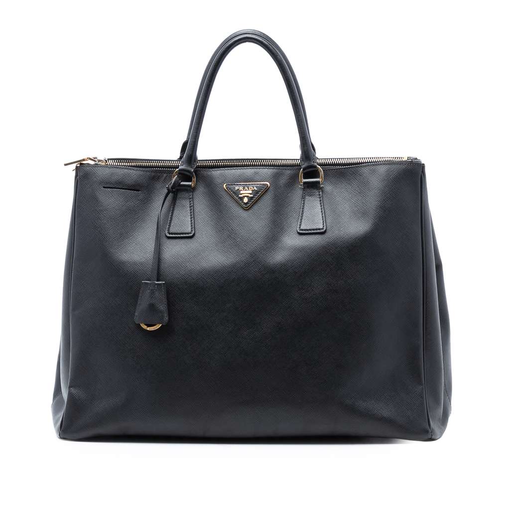 The Galleria features a saffiano leather body, a clochette, rolled handles, dual top zip compartments, and interior zip and slip pockets.