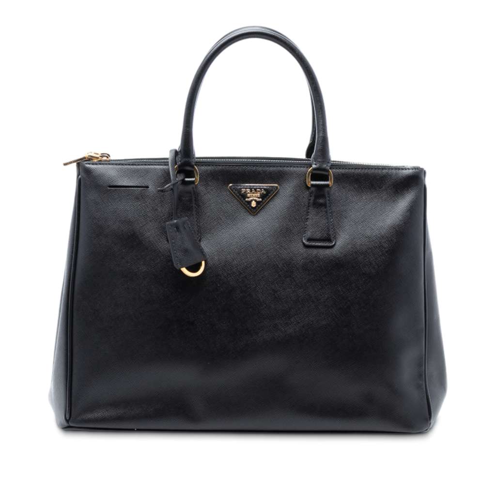 The Galleria features a saffiano leather body, rolled handles, an open top, dual top zip compartments, and interior zip and slip pockets.