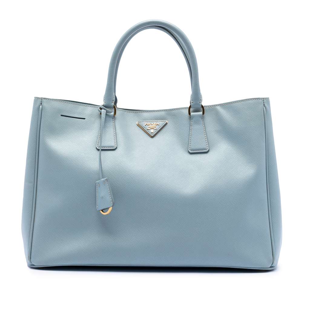 The Galleria features a saffiano leather body, rolled leather handles, an open top with magnetic snap closure, and interior zip and slip pockets.