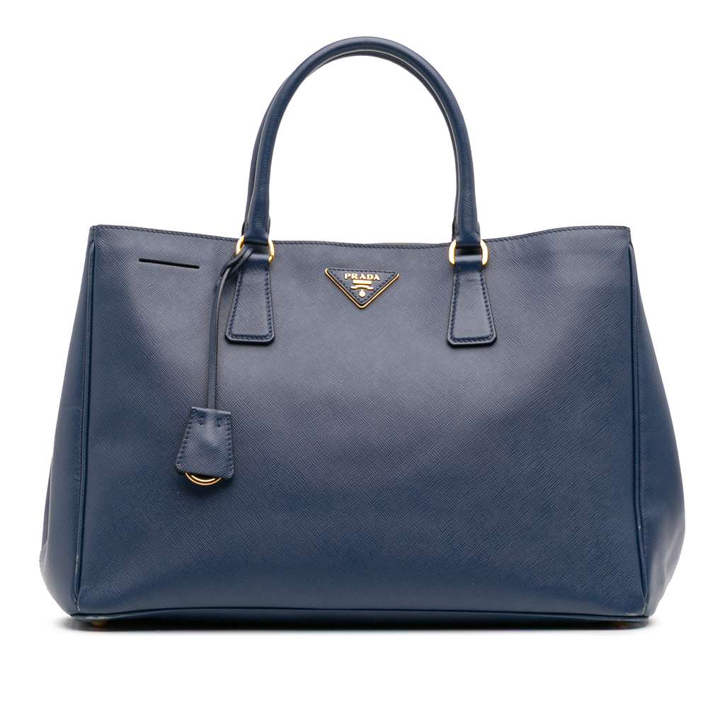The Galleria bag features a saffiano leather body, rolled leather handles, an open top with magnetic snap closure, and interior zip and slip pockets.