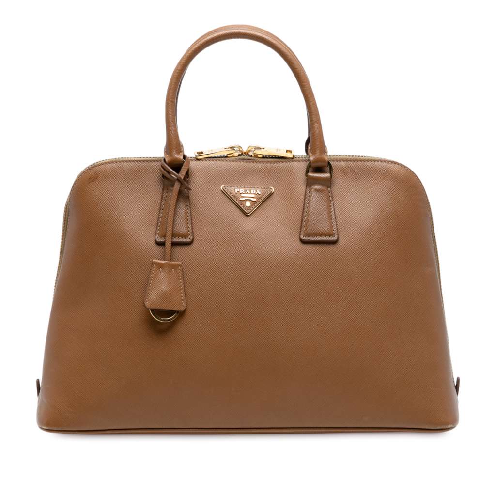 The Promenade satchel features a saffiano lux leather body, rolled leather handles, a top zip around closure, an interior center zip compartment, and interior zip and slip pockets.
