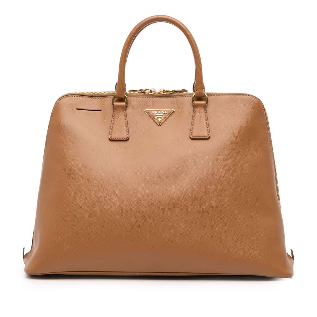 The Promenade features a saffiano leather body, rolled leather handles, a double zip around closure, an interior center zip compartment, and interior zip and slip pockets.