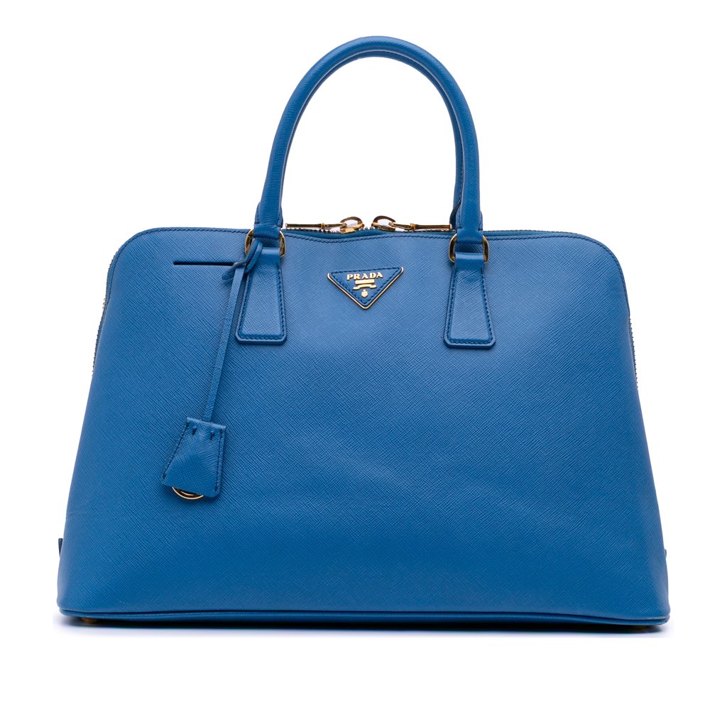 The Promenade features a saffiano leather body, rolled leather handles, a double zip around closure, an interior center zip compartment, and interior zip and slip pockets.