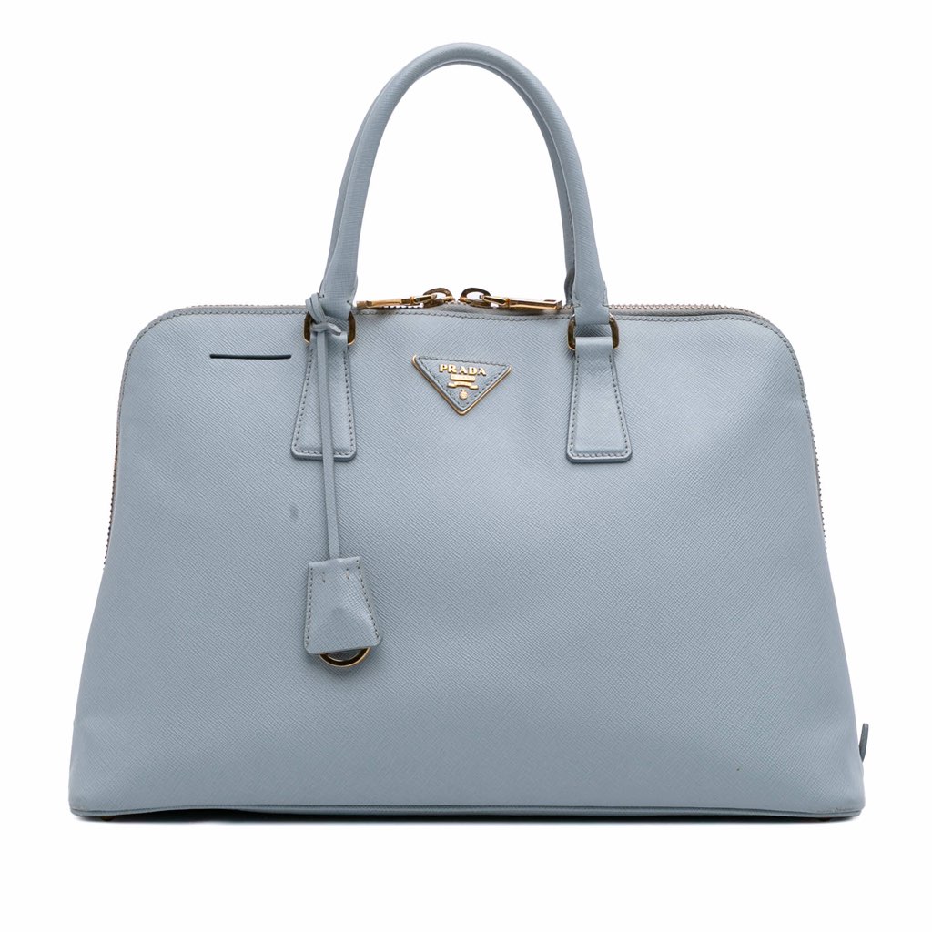 The Promenade features a saffiano leather body, rolled leather handles, a double zip around closure, an interior center zip compartment, and interior zip and slip pockets.