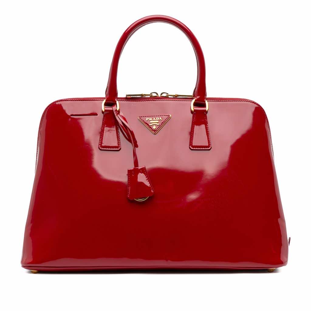 The Promenade features a patent leather body, rolled leather handles, a detachable flat leather strap, a top zip around closure, and interior zip and slip pockets.
