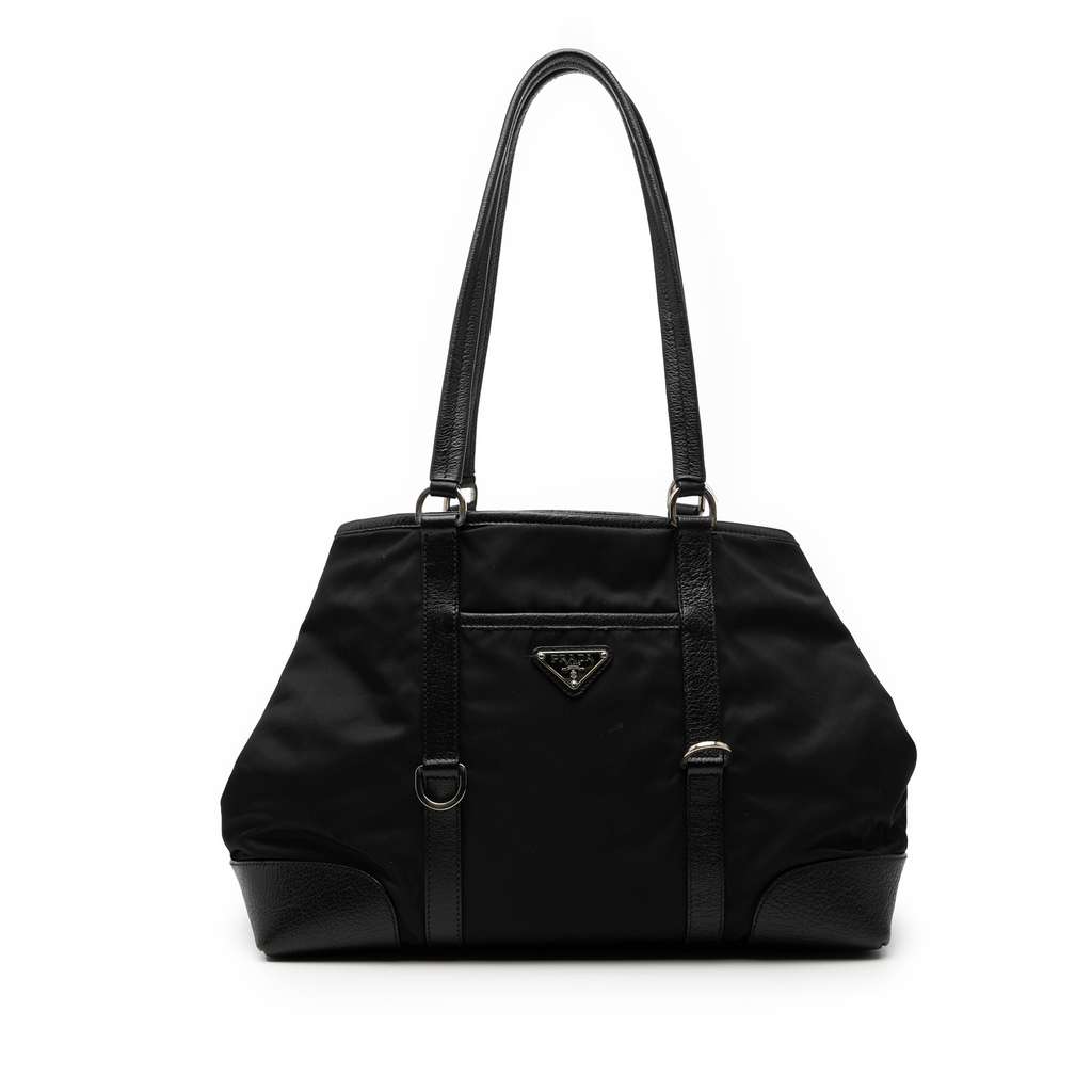 This tote features a nylon body with leather trim, flat leather straps, an open top, exterior slip pockets, and an interior zip pocket.