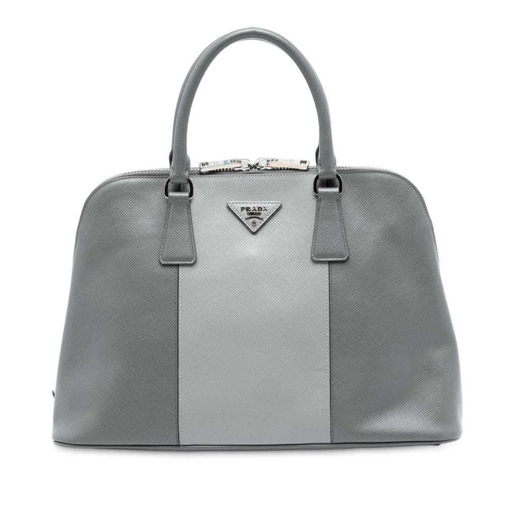 This satchel features a saffiano leather body, rolled leather handles, a top zip closure, an interior zip compartment, and interior zip and slip pockets.