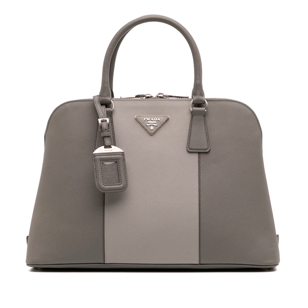 This satchel features a saffiano leather body, rolled leather handles, a top zip closure, an interior zip compartment, and interior zip and slip pockets.