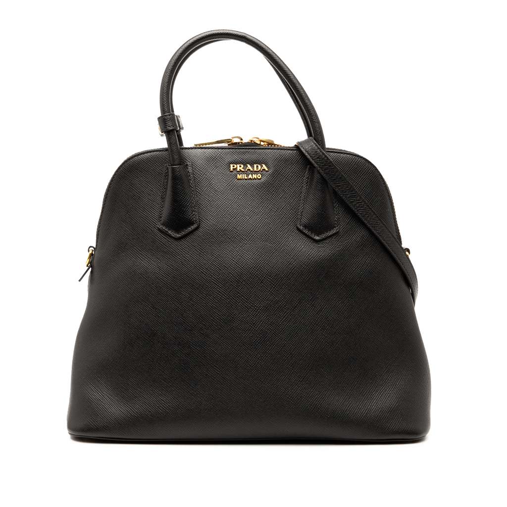 This satchel features a saffiano leather body, rolled leather handles, a detachable flat leather strap, a zip around closure, and interior zip and slip pockets.