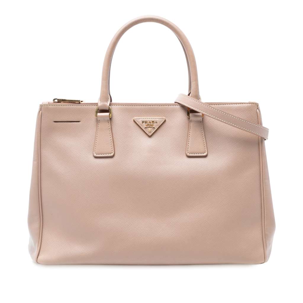 The Galleria satchel features a saffiano leather body, rolled leather handles, a detachable strap, an open top with magnetic snap button closure, zip compartments, and interior zip and slip pockets.