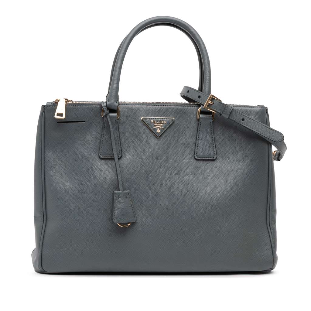 The Galleria satchel features a saffiano leather body, rolled leather handles, a detachable strap, an open top with magnetic snap button closure, zip compartments, and interior zip and slip pockets.
