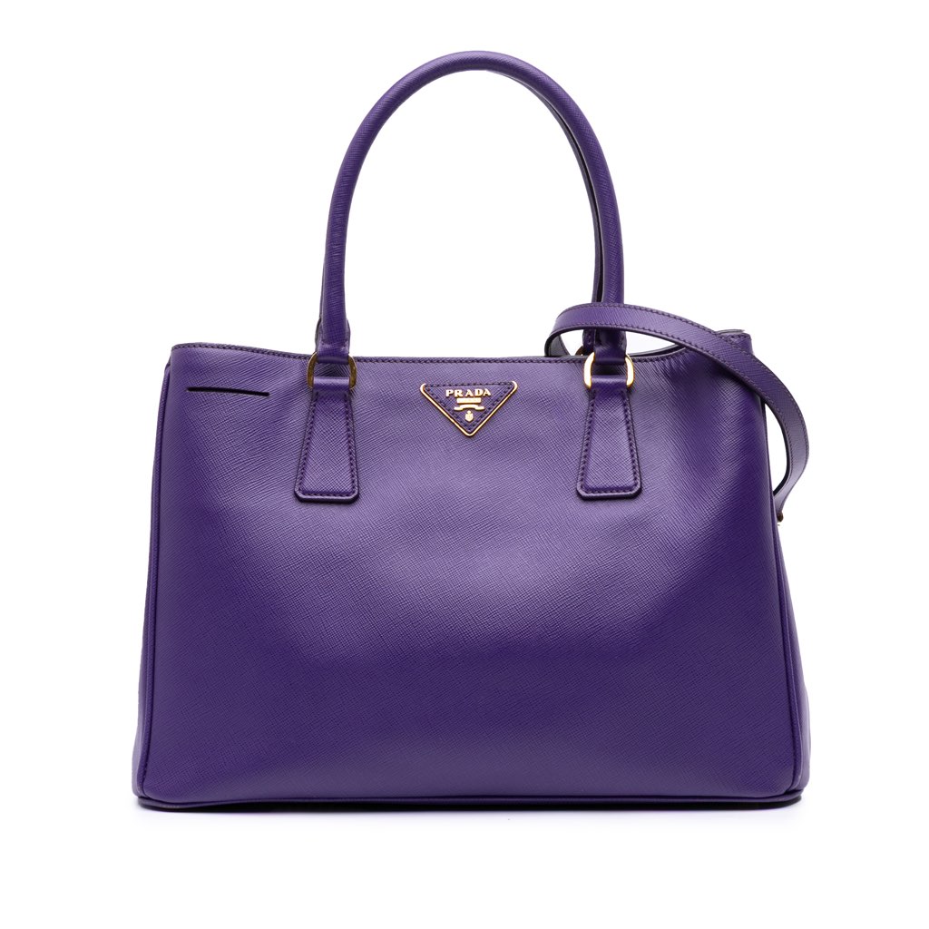 The Galleria features a saffiano leather body, rolled leather handles, a detachable flat leather strap, an open top with magnetic snap closure, an interior zip compartment, and interior zip and slip pockets.