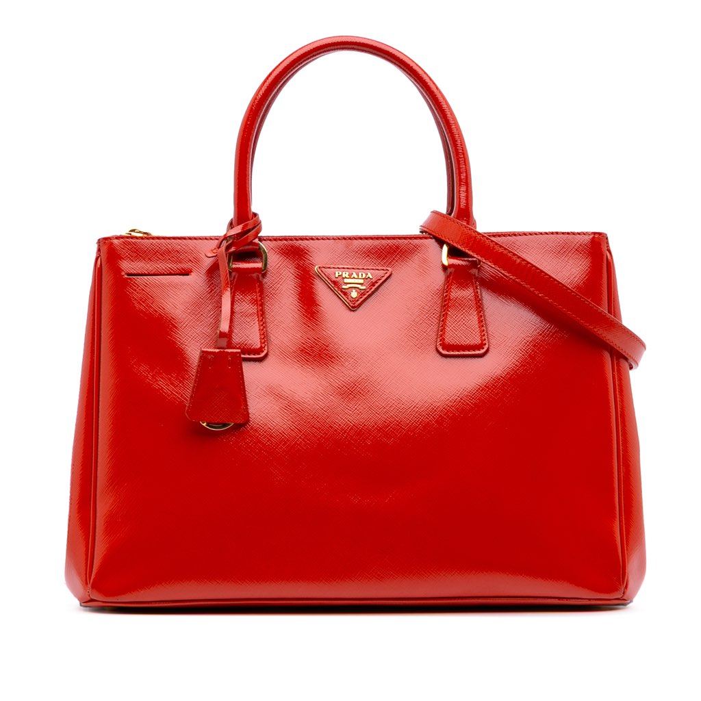The Galleria features a leather body, rolled leather handles, a detachable flat strap, an open top, double zip compartments, and interior zip and slip pockets.