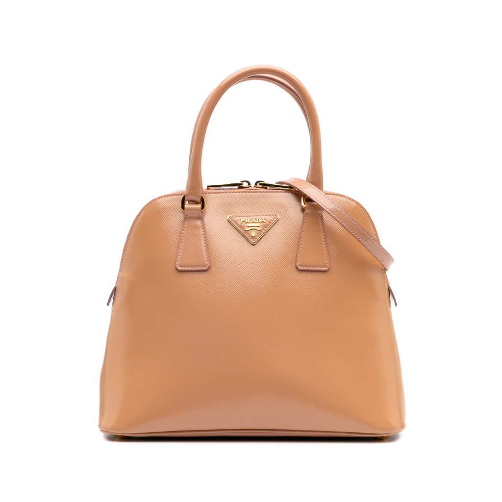 The Promenade Satchel features a saffiano vernice leather body, rolled leather handles, a detachable flat leather strap, double zip around closure, an interior center zip compartment, and interior zip and slip pockets.