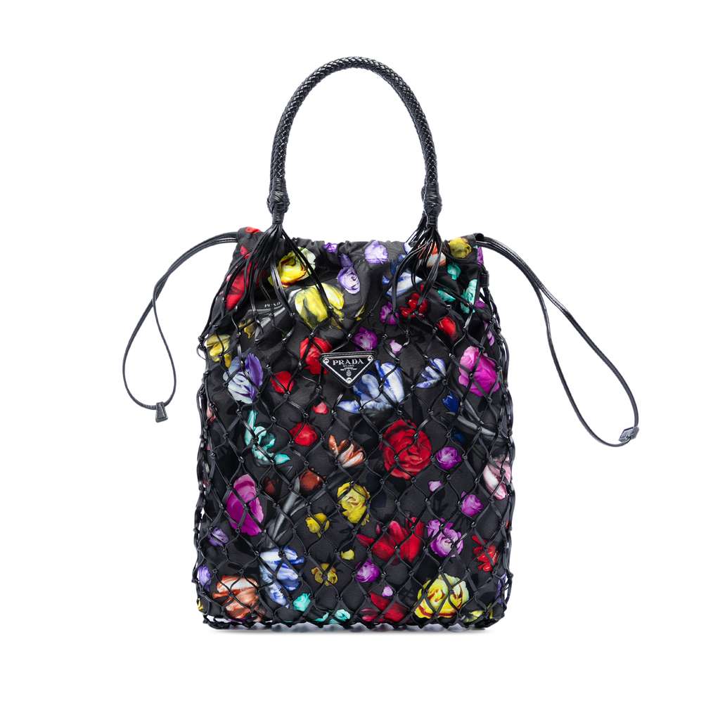 Prada Mesh Leather and Floral Printed Tessuto Tote Black Med