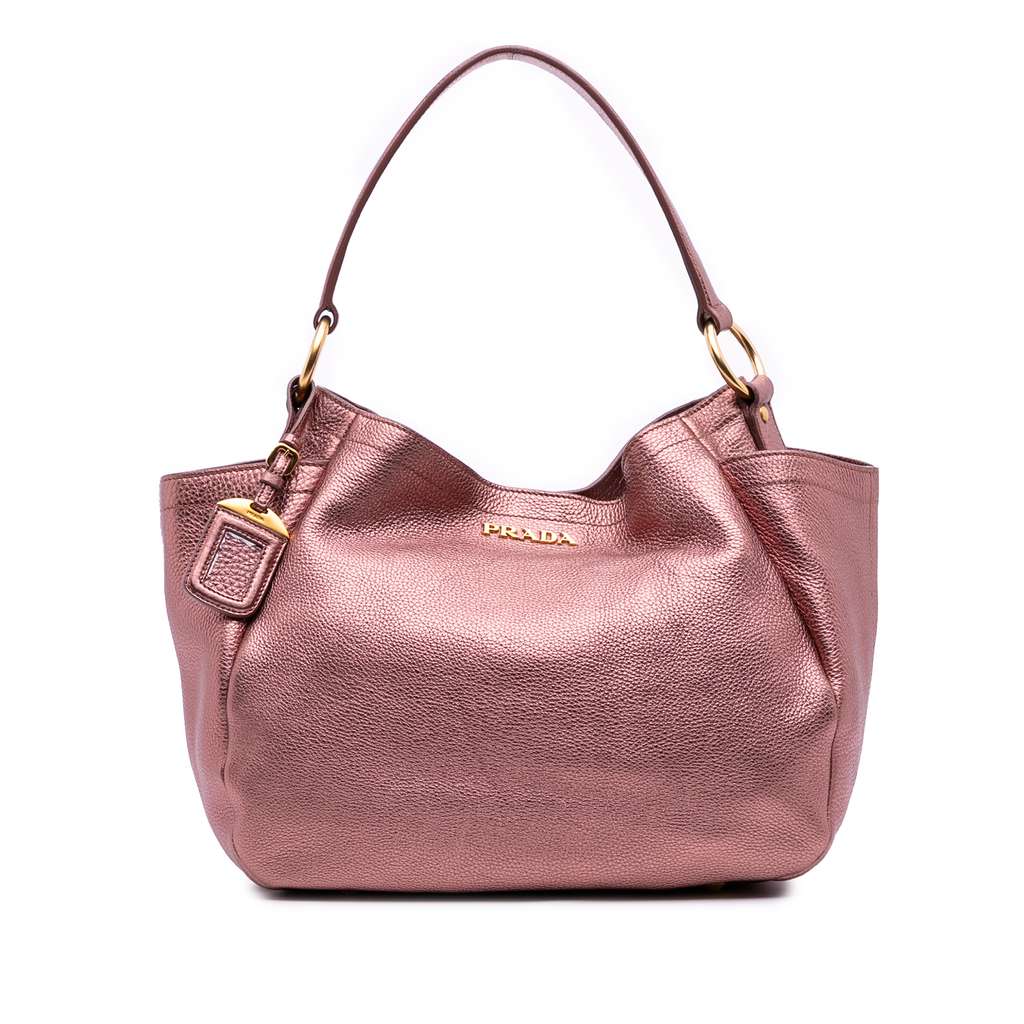 This tote bag features a metallic leather body, flat leather straps, an open top with magnetic closure, exterior side slip pockets, and interior zip and slip pockets.