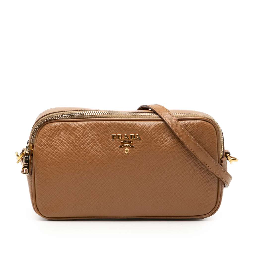 Prada Mini Saffiano Double Zip Crossbody Brown Mini Leather