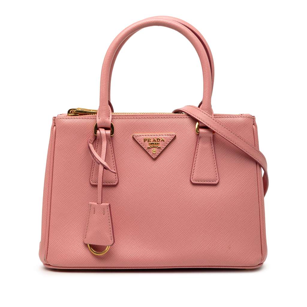 The Galleria satchel features a saffiano leather body, a clochette, rolled leather handles, a detachable and adjustable flat leather strap, top zip compartments, and interior zip and slip pockets.