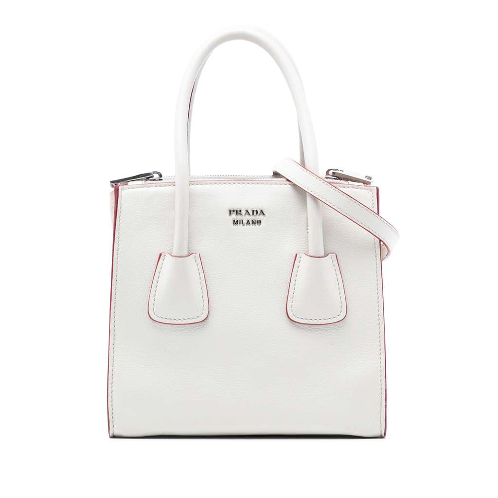 The Twin Pocket satchel features a calfskin body with suede leather trim, rolled leather handles, a detachable flat leather strap, an open top, dual zip compartments, and interior zip and slip pockets. Exterior corners have been repainted.
