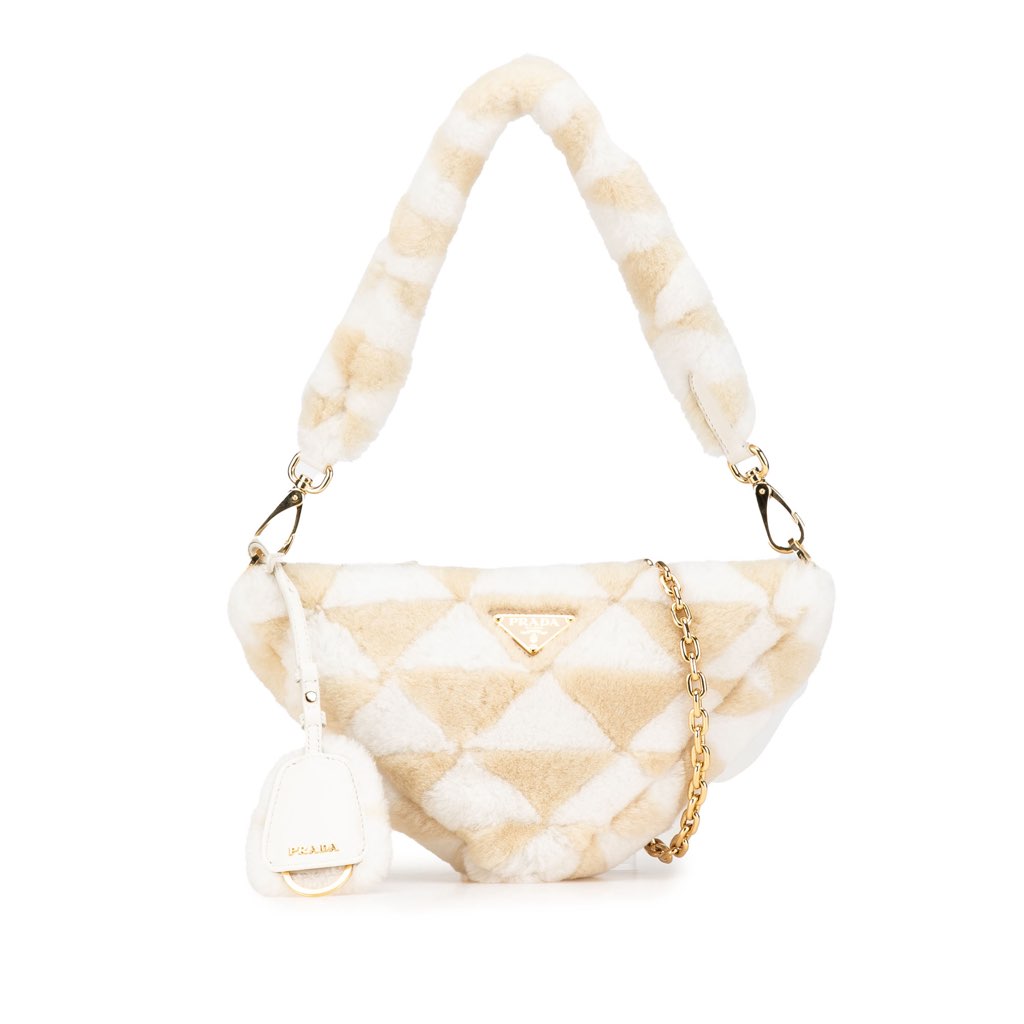 This satchel features a shearling body with leather trim, a detachable shearling handle, a detachable strap, and a top zip closure.