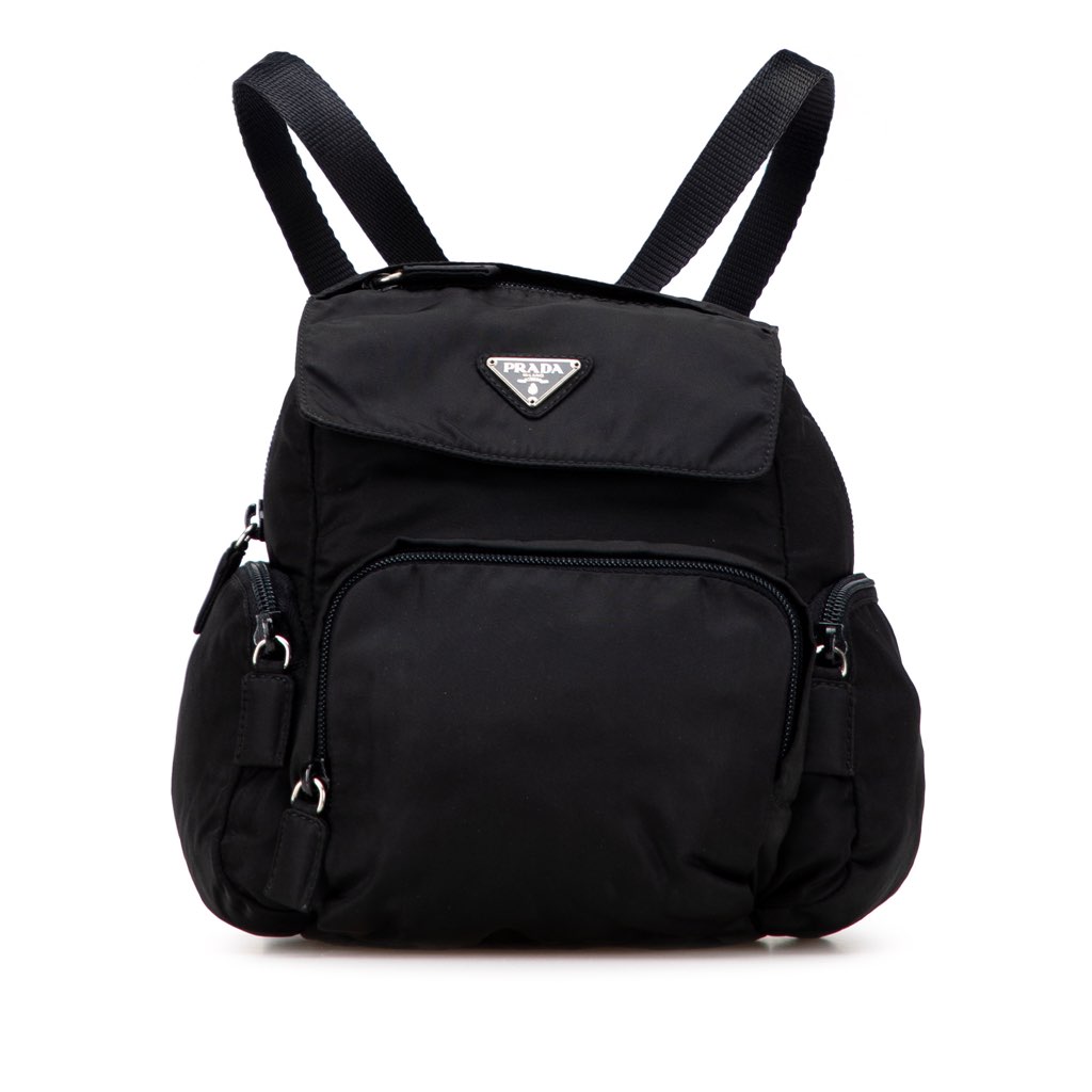 This backpack features a nylon body, a flat top handle, flat back straps, a top flap with buckle closure, a drawstring closure, exterior zip pockets, and an interior zip pocket.
