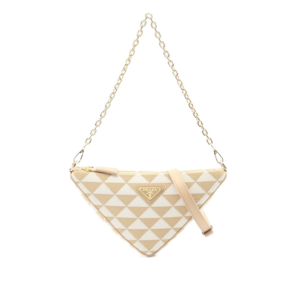 The Triangle Symbole satchel features a canvas body, a removable chain handle, an adjustable and detachable flat leather strap, and a top zip closure.