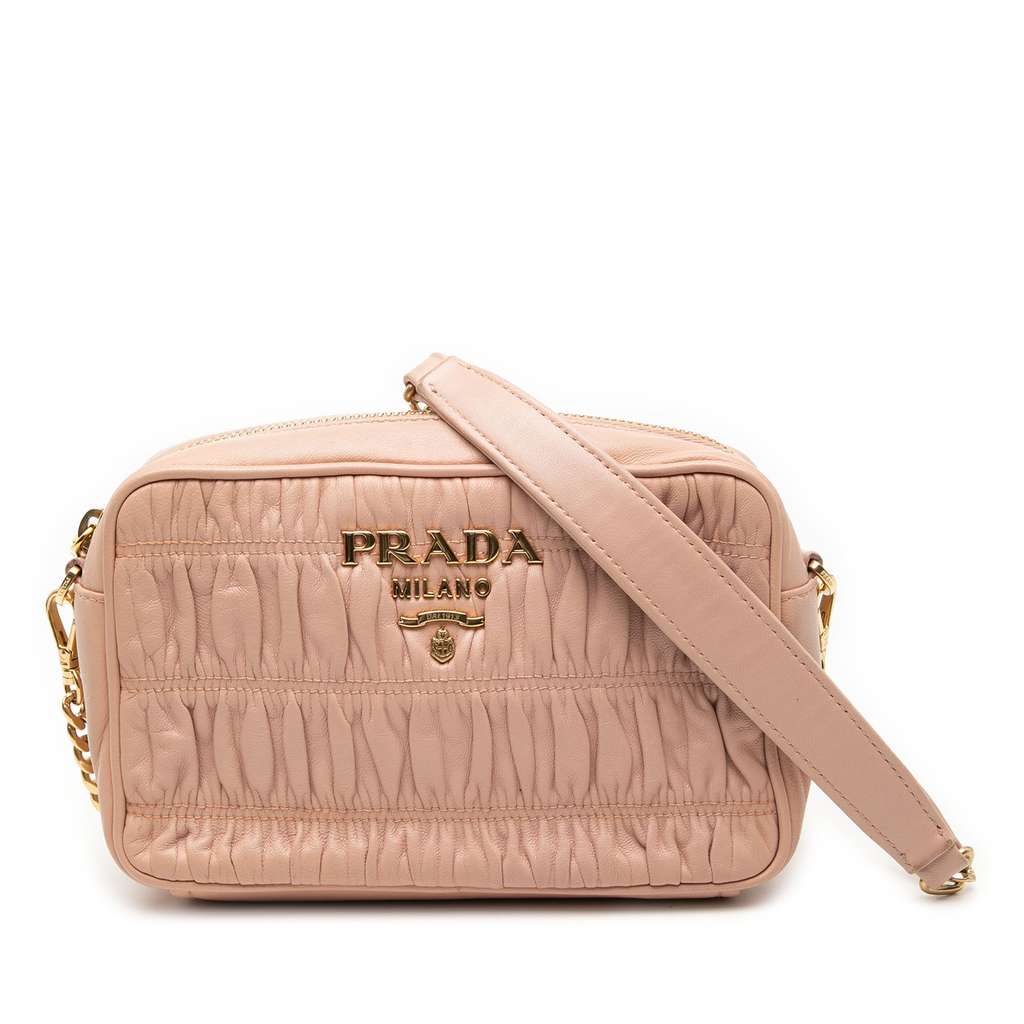 This crossbody bag features a gathered leather body, a chain link strap with a flat leather guard, a top zip closure, and an interior slip pocket.