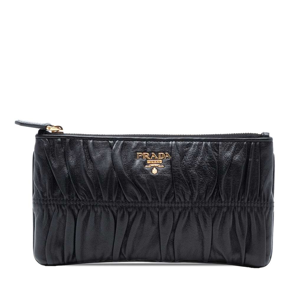 This pouch features a gathered leather body and top zip closure.