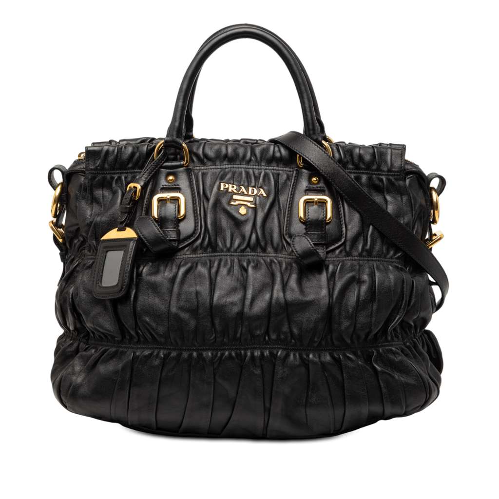 This satchel features a gathered nappa leather body, rolled leather handles, a detachable strap, a top zip closure, and interior zip and slip pockets.