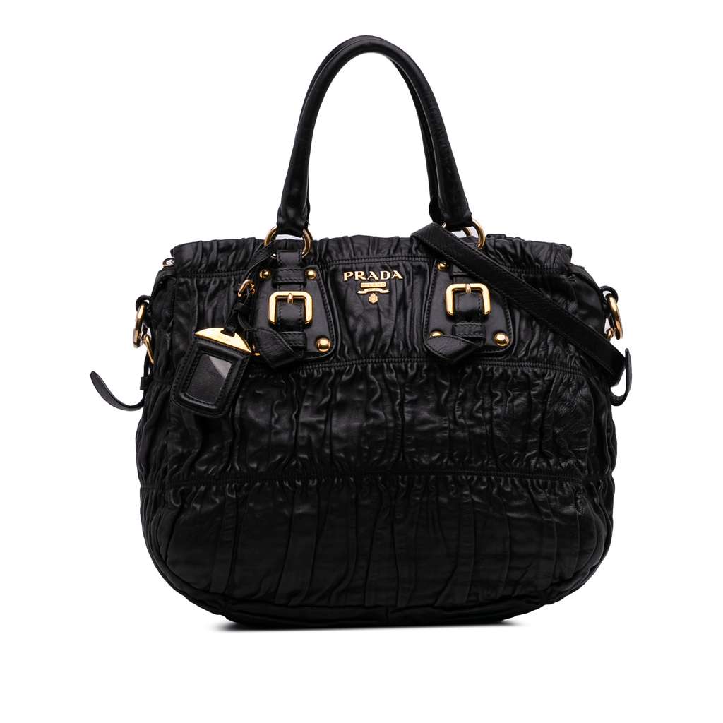 This satchel features a gathered nappa leather body, rolled leather handles, a detachable strap, a top zip closure, and interior zip and slip pockets.