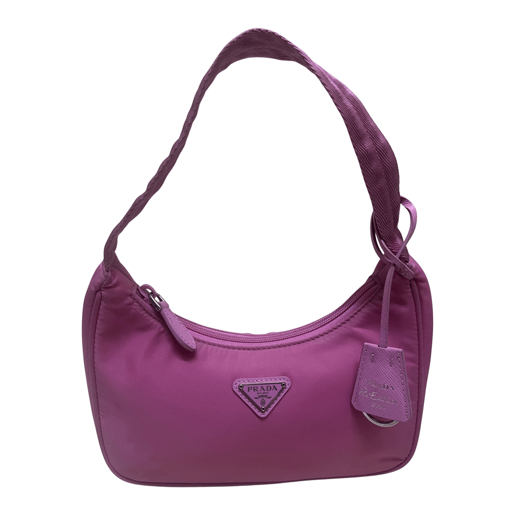 PradaReNylon ReEdition2000 Mini Bag (Pink), specifically in a pink (alabaster) hue:Details•Material: ReNylon •Color: Alabaster Pink •Hardware: Silver-tone, with Prada enameled triangle logo •Top zip closure •Handle: Woven tape top handle •Lining: ReNylon with Prada logo print Measurements•: 17 cm (H) 22 cm (W) 6 cm (D).