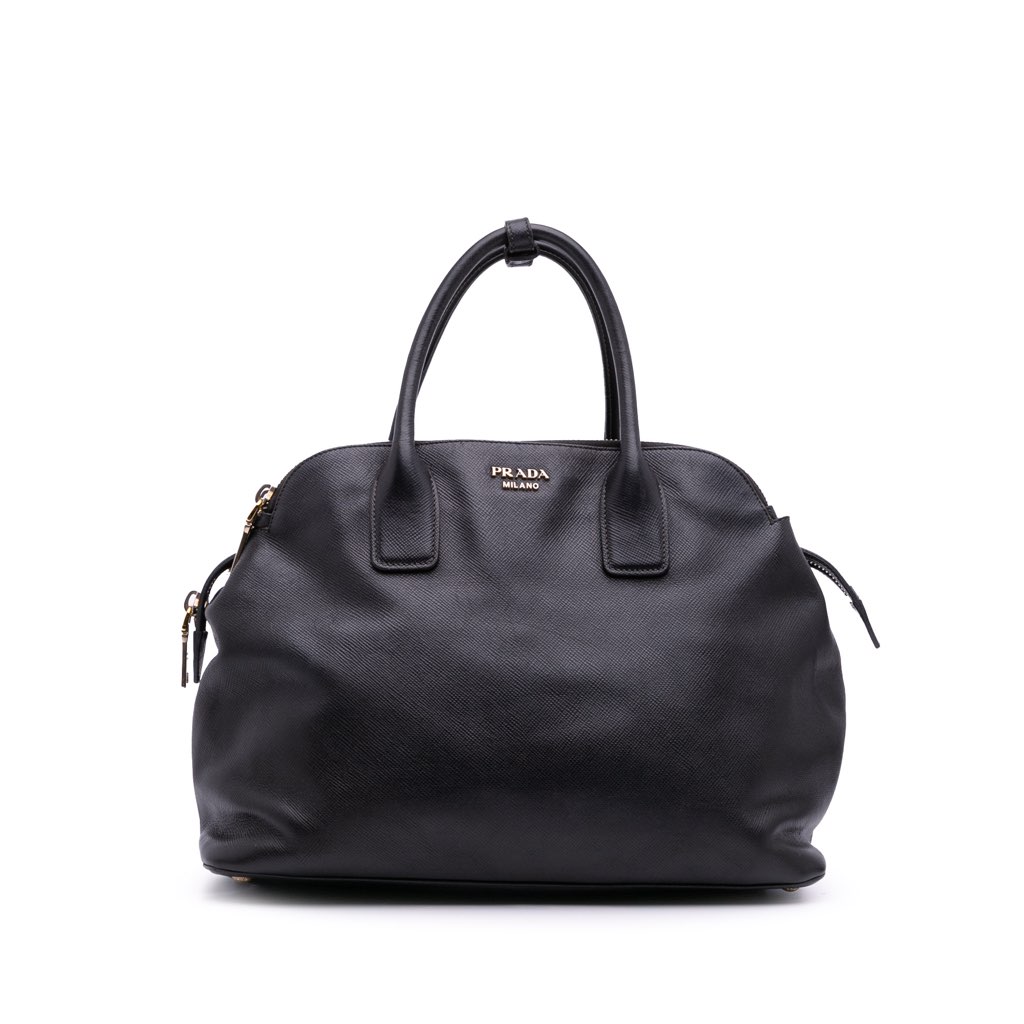 This handbag features a saffiano leather body, rolled leather handles, three compartments with zip closure, and interior zip and slip pockets.